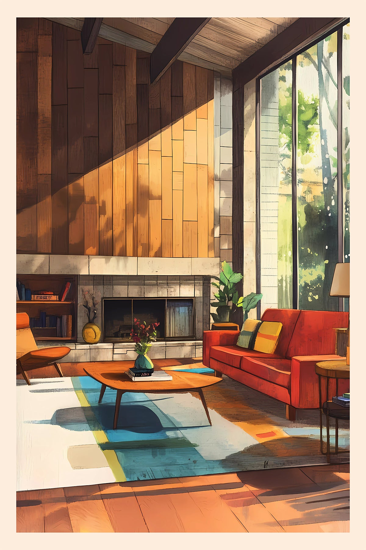 Bring timeless style into your home with this mid-century modern interior print, featuring a warm and inviting living room filled with iconic design details. From the rich wood paneling and exposed beams to the vibrant red sofa, geometric rug, and minimalist coffee table, this artwork captures the essence of 1950s–60s modernist design. Large glass windows flood the space with natural light, blending the indoors with the outdoors — a hallmark of modern architecture and interior design.