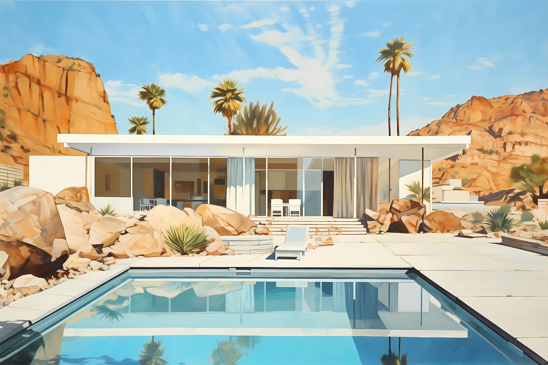 Bring the sunshine of Palm Springs into your home with this mid-century modern architecture art print. Featuring a sleek desert home with floor-to-ceiling glass, flat roof, and poolside reflections framed by rocky landscapes and palm trees, this artwork perfectly celebrates the iconic Californian modernist lifestyle. This piece blends architectural precision with warm desert tones, making it a statement artwork for your living room, office, or gallery wall.