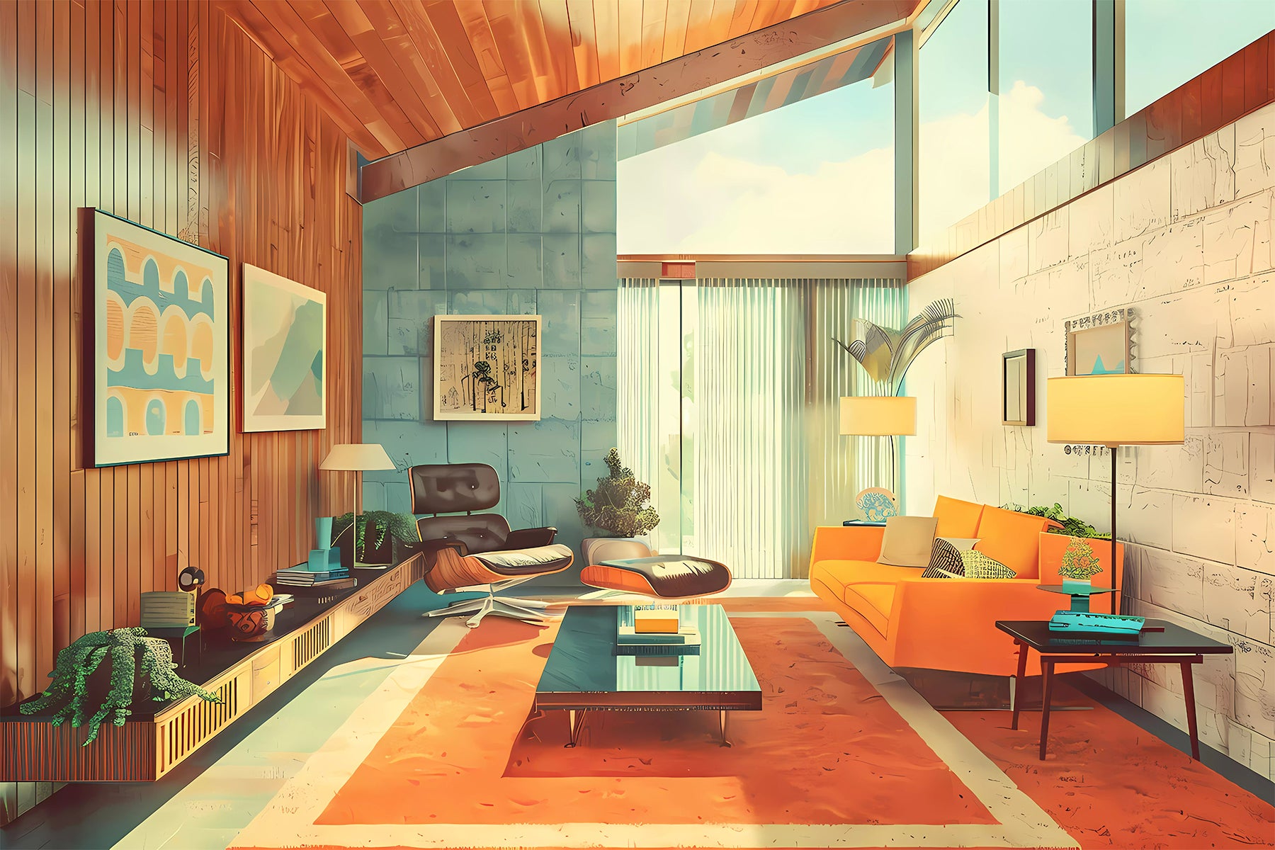Bring the warmth of mid-century modern design into your space with this stunning art print, showcasing a retro-inspired living room filled with iconic furniture and bold geometric accents. Featuring an Eames lounge chair, orange sofa, teak wood paneling, and floor-to-ceiling windows, this artwork captures the essence of 1950s–1960s design. Perfect for lovers of vintage interiors, modernist architecture, and retro color palettes, it instantly elevates any wall with timeless sophistication.